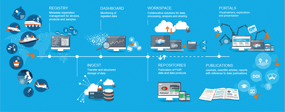 The Alfred Wegener Institute (AWI) Helmholtz Centre for Polar and Marine Research has been committed over decades to develop and sustain an eResearch infrastructure for coherent discovery, view, dissemination, and archival of scientific data and related information in polar and marine regions. In order to address the increasing heterogeneity of research platforms and respective devices and sensors along with varying project-driven requirements, a generic and modular framework has been built intended to support the flow of sensor observations to archives (O2A) (Koppe et al, 2015). O2A supports the scientific workflows by providing data streaming and transfer solutions to a collaborative workspace ecosystem along with modern analytical tools and infrastructure. Adopting FAIR data principles, the World Data Center PANGAEA ensures data preservation and the various portal solutions provide integrative one-stop-shop frameworks for discovering and re-using the existing metadata, data and data products.