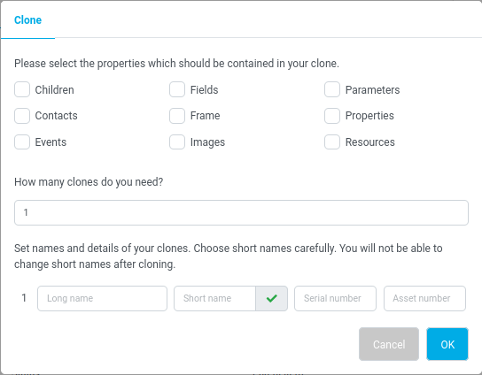 The following dialog box allows you to create one to ten clones of your item. By selecting or unselecting the checkboxes at the top, you can specify which part of the item should be cloned and which should not.