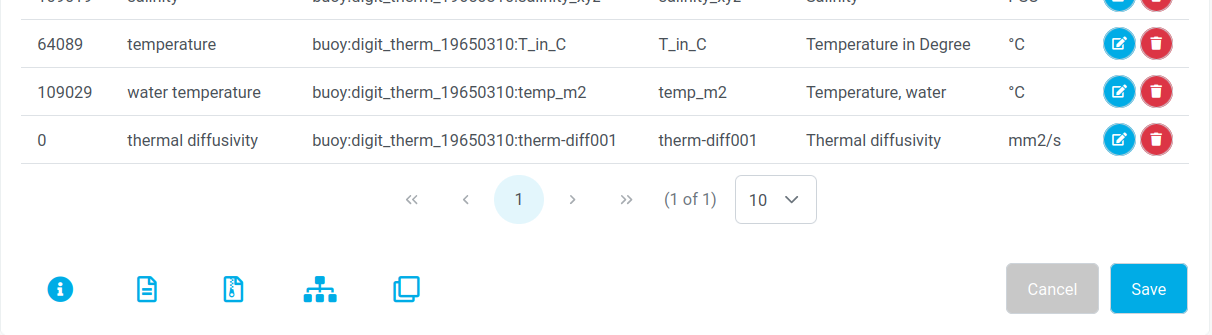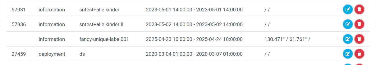 If items need to be altered, this can be achieved by clicking the blue-white pen and paper symbols at the end of the row when the user is logged in.